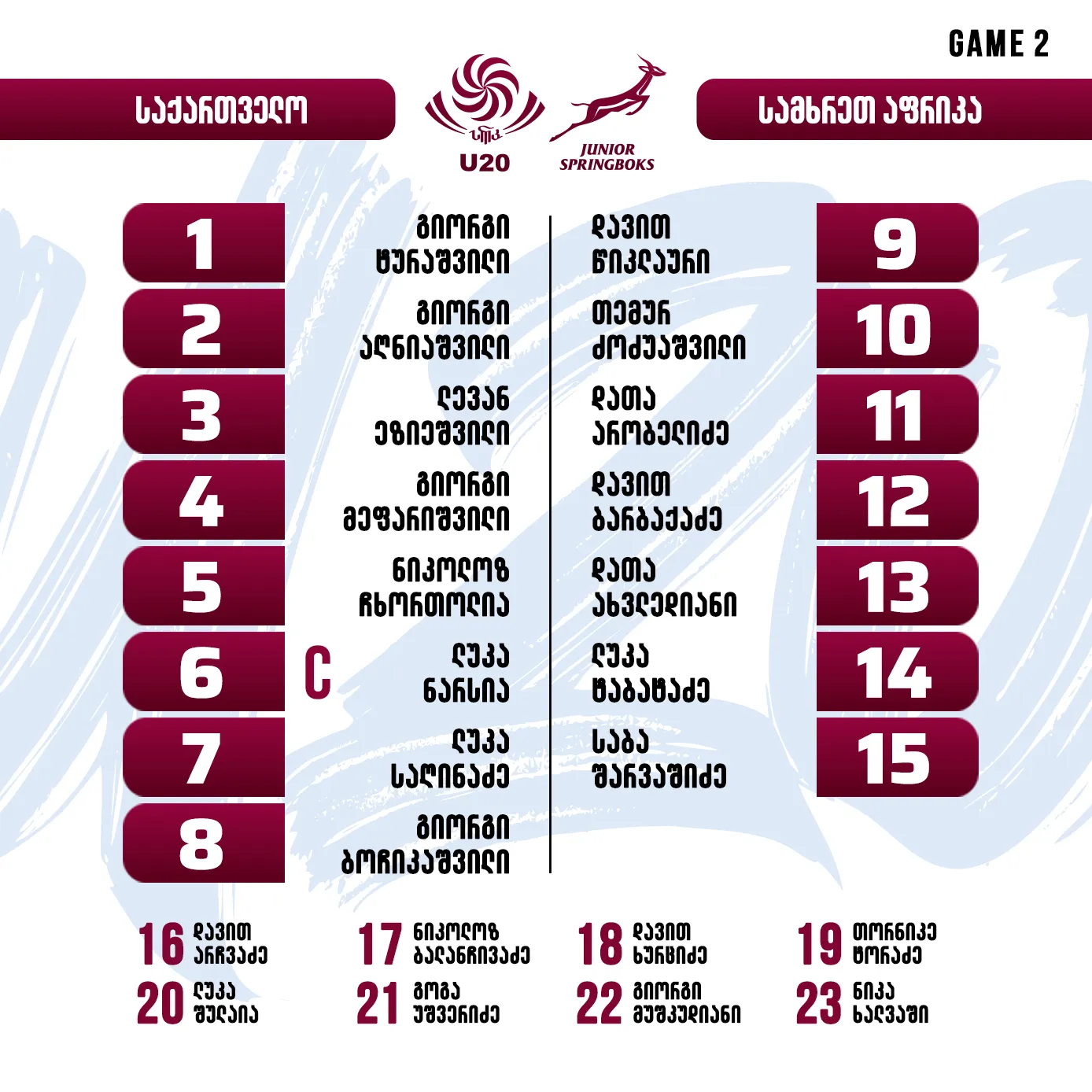 20 წ. | სამხრეთ აფრიკასთან მეორე მატჩისთვის 23 მორაგბე შეირჩა
